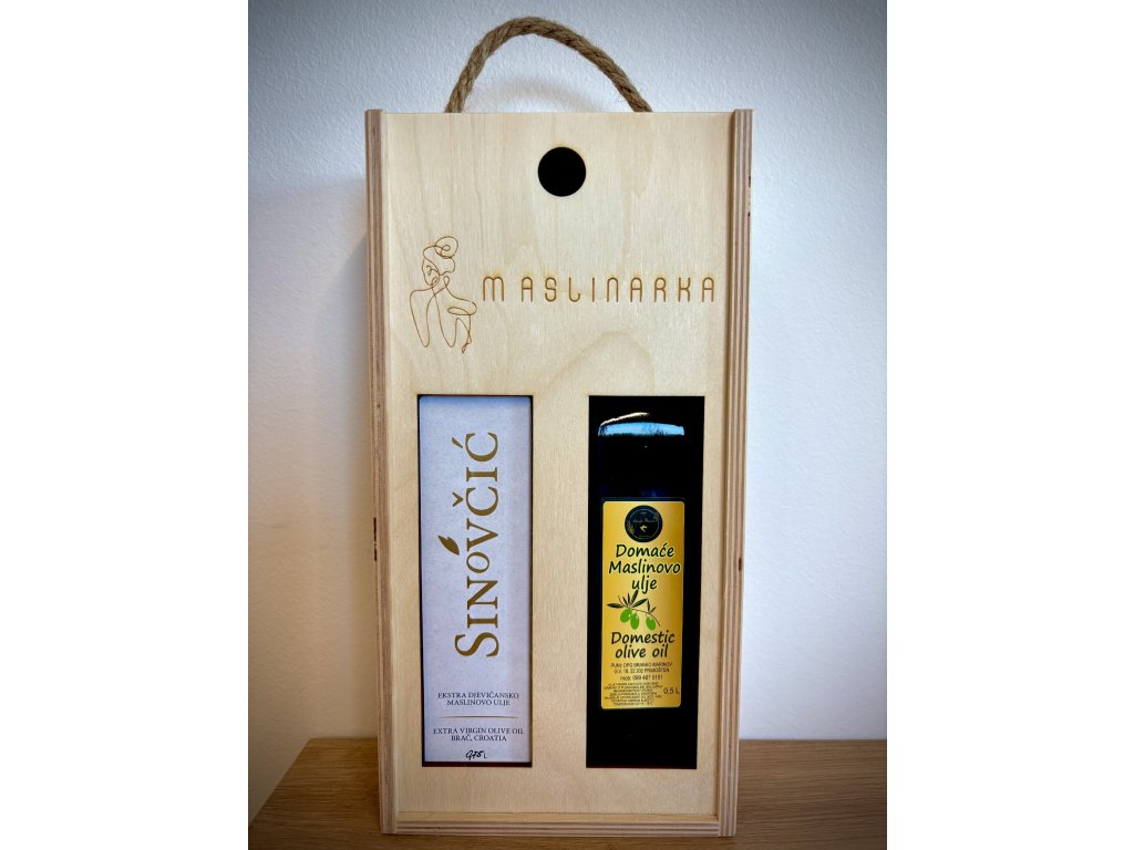 Objavte dva jedinečné olivové oleje z Chorvátska v elegantnom darčekovom balení. Maslinarka Sinovčić&Marinov obsahuje: OPG Branko Marinov 500 ml a OPG Sinovčić 750 ml. Každý olej je starostlivo lisovaný z kvalitných olív, ktoré prinášajú autentickú chuť Chorvátska priamo na váš stôl. Ideálne ako darček pre gurmánov alebo pre vlastnú kulinársku inšpiráciu. Baleno v štýlovej drevenej krabici, pripravené na darovanie.